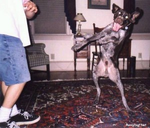 Wer sagt eigentlich, dass man alleine tanzen muss? Zusammen tanzt es sich doch bekanntlich viel schöner! Die beiden Hunde tanzen richtig flott zusammen, da kann sich so manches Menschenpaar eine Scheibe von abschneiden. Ihr habt Bilder von tanzenden Hunden? Bitte schickt mir die Bilder, damit ich sie hier vorstellen kann und die Welt darüber lachen kann!