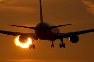 In diesem Flugzeug muss man sich nicht fürchten zu sitzen, auch wenn es so aussieht, als würde gerade eine der Turbinen explodieren. Kommt halt alles auf den Fotowinkel an, gell? Hallo (schläfrig), es sieht so aus, würde gerade eine Flugzeugturbine explodieren, gähn. Und dass bei so einem schönen Start in Richtung Sonnenaufgang.